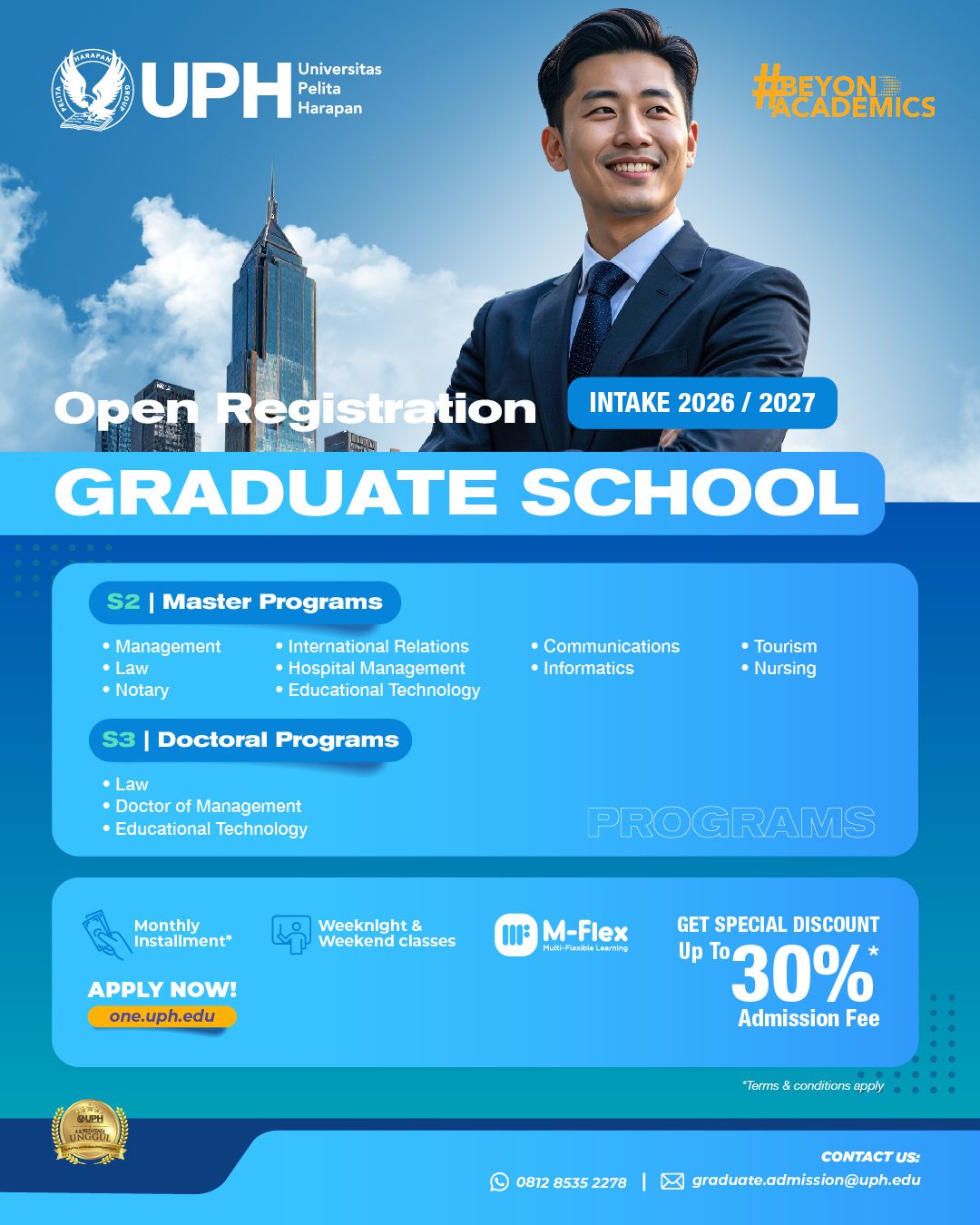New student admission for UPH postgraduate programs for 2026/2027 Intake is now open. Don’t miss a chance to get an admission fee discount of up to 30%*. Register now via one.uph.edu!